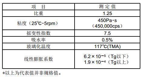 加热减量=2.4wt%(主要是水分)[测定方法]将未固化的Seal-glo NE7200HD放置于150℃的热风烘箱中, 30分钟后进行测定。