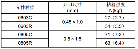 试验方法: 用印刷机涂布后, 放置72小时。 然后将0805C元器件贴装上去, 在以上所定的固化条件下固化后过1小时测定的接着强度。