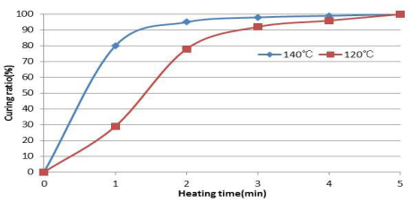 使用差示扫描量热仪DSC(Differential Scanning Calorimetry ) , 来测定在固化条件140℃和120℃的情况下的反应时间和固化率的推移。