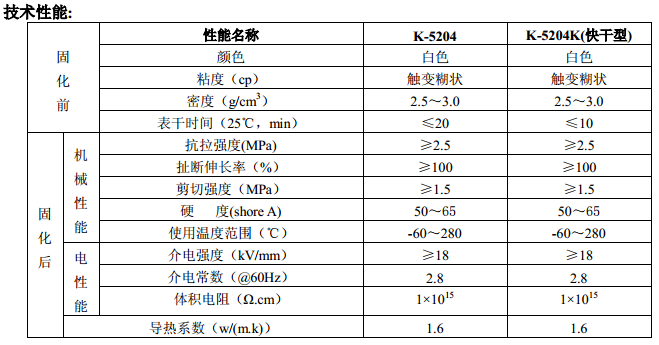 K-5204 有机硅导热胶既有粘接作用,又有优异的导热(散热)性。是一种经过补强的中性有机硅弹性胶,胶固化后有良好的耐高低变化性能,长期使用不会脱落,不会产生接触缝隙降低散热效果;因为有了补强,该胶有较高的粘接强度,剪切强度≥15 公斤/平方厘米。具有优异的耐高低温性能。它的使用温度范围为-60~280℃;该胶是一种单组分室温固化胶,用 100 毫升金属软管包装使用非常方便。